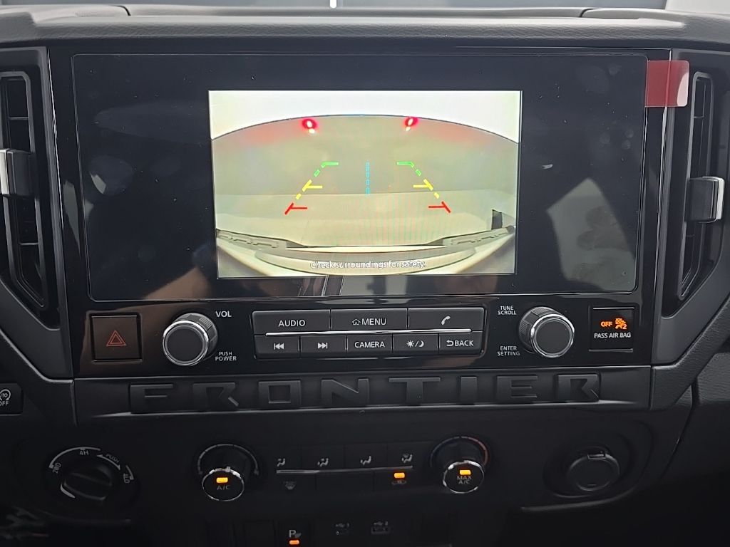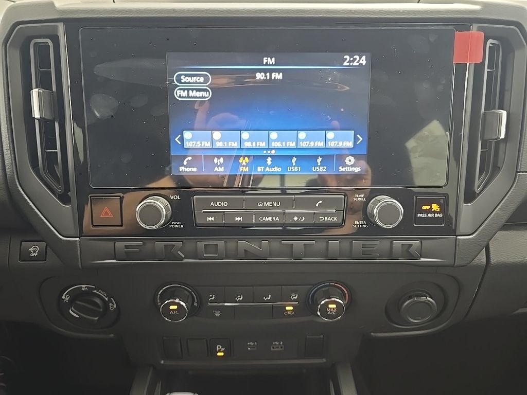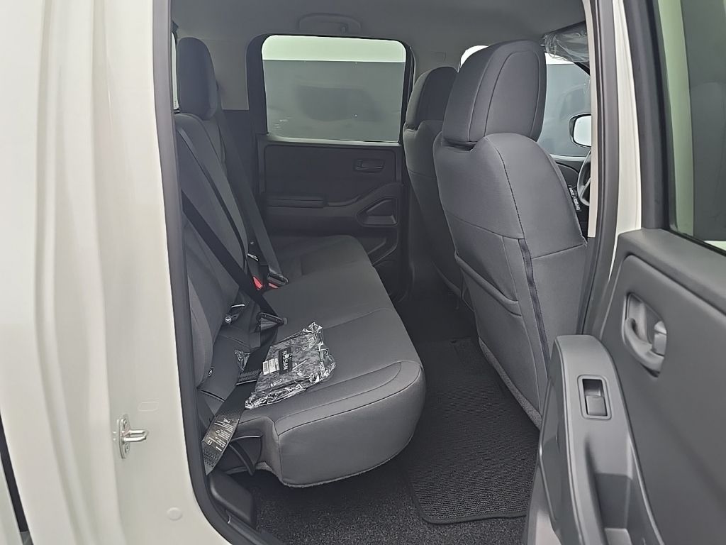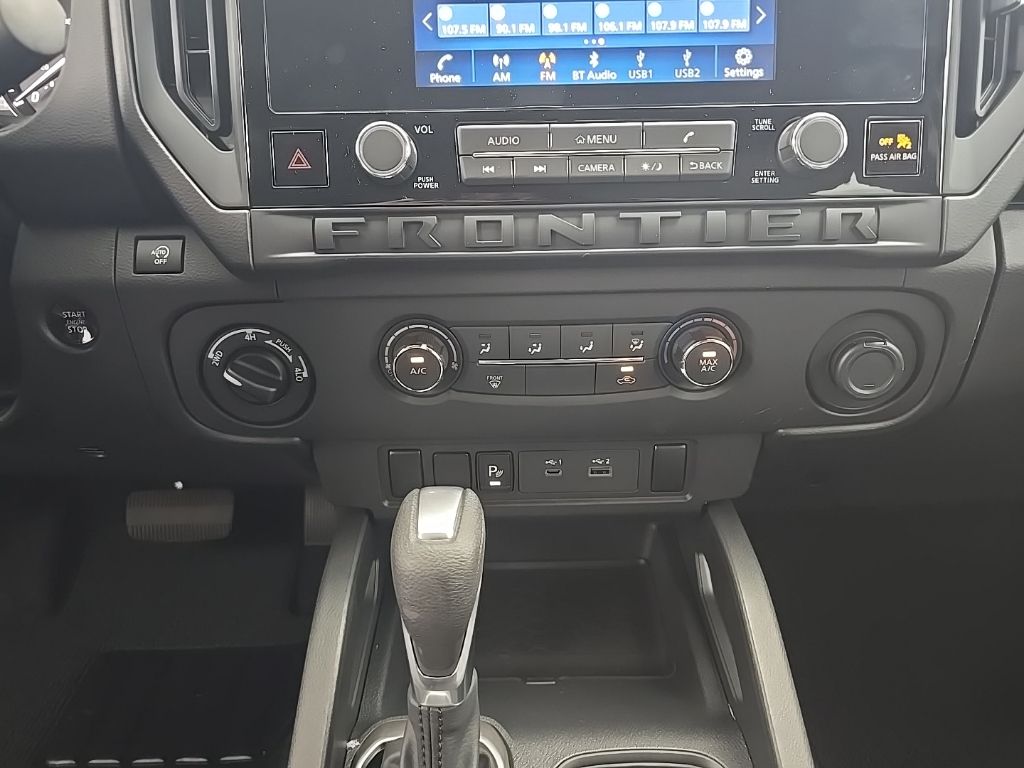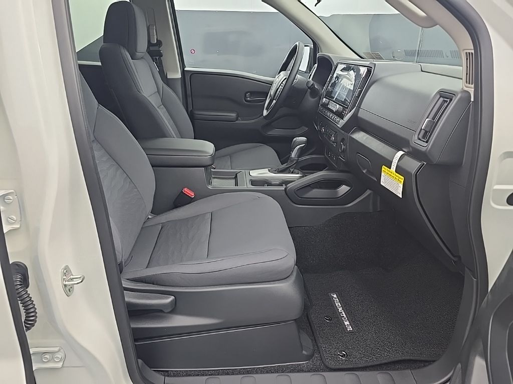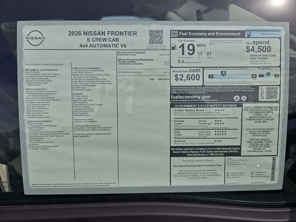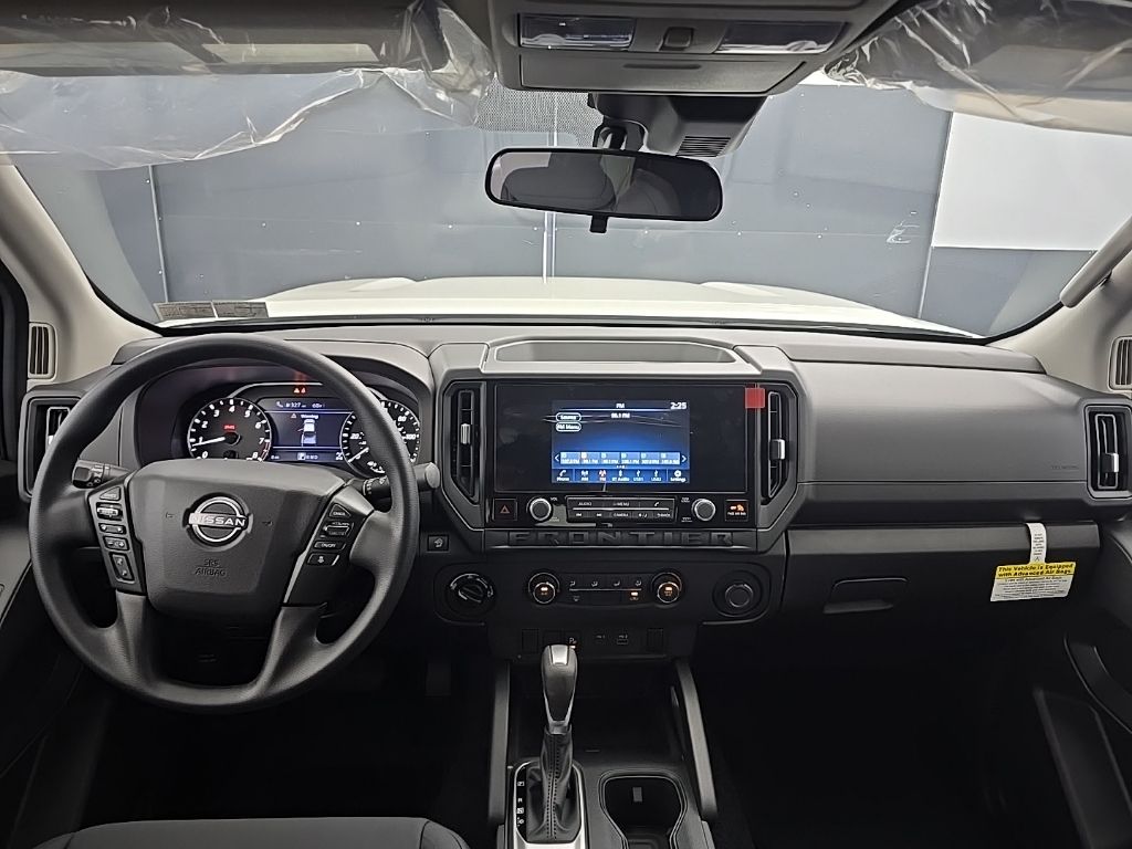 Glacier White 2026 Nissan Frontier S 4WD 9-Speed Automatic with Overdrive 3.8L DI DOHC 24V V6 16" Alloy Wheels, 3.692 Axle Ratio, 4 Speakers, 4-Wheel Disc Brakes, ABS brakes, Air Conditioning, Alloy wheels, AM/FM radio, Anti-whiplash front head restraints, Apple CarPlay/Android Auto, Auto High-beam Headlights, Blind Spot Warning, Brake assist, Bumpers: body-color, Carpeted Floor Mats, Cloth Seat Trim, Delay-off headlights, Driver door bin, Dual front impact airbags, Dual front side impact airbags, Electronic Stability Control, Emergency communication system, Front anti-roll bar, Front Bucket Seats, Front Center Armrest, Front reading lights, Front wheel independent suspension, Fully automatic headlights, Illuminated entry, Knee airbag, Low tire pressure warning, Occupant sensing airbag, Overhead airbag, Overhead console, Panic alarm, Passenger door bin, Power steering, Power windows, Radio data system, Radio: AM/FM/Auxiliary/USB Audio System, Rear anti-roll bar, Rear side impact airbag, Rear step bumper, Remote keyless entry, Speed control, Speed-sensing steering, Splash Guards, Split folding rear seat, Steering wheel mounted audio controls, Tachometer, Telescoping steering wheel, Tilt steering wheel, Traction control, Trip computer, Variably intermittent wipers.