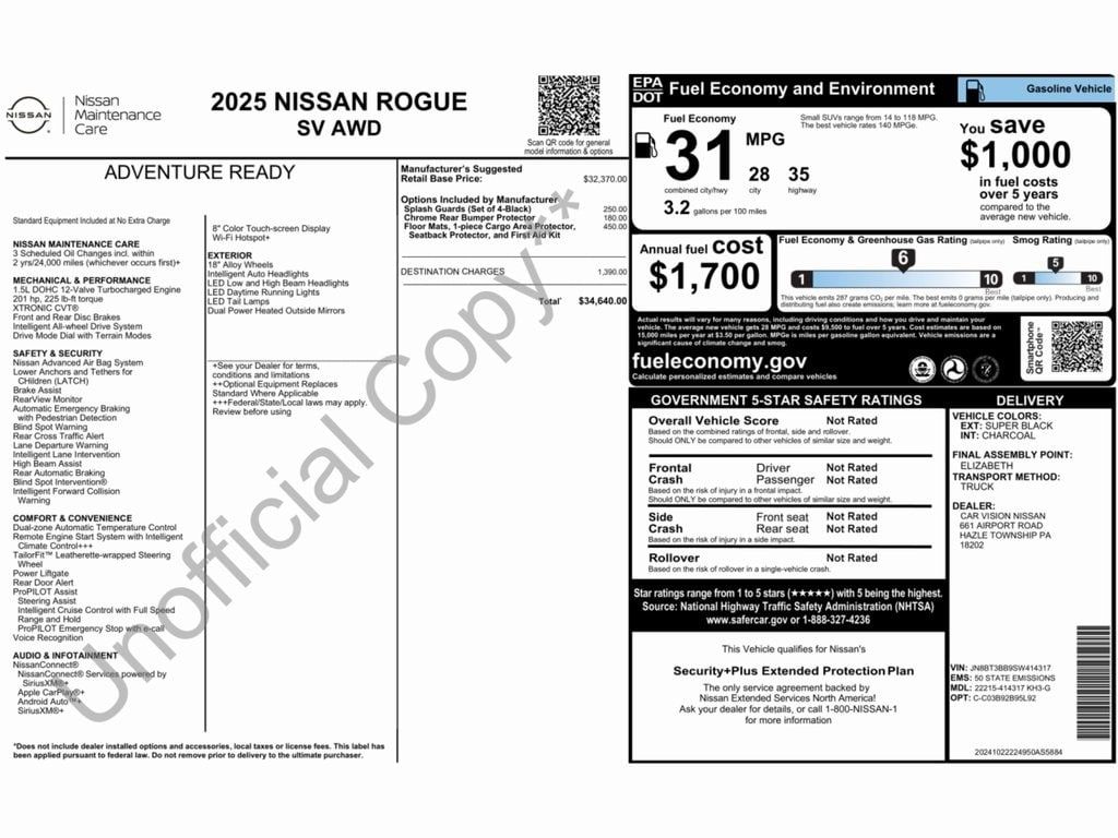 The MSRP (Manufacturer’s Suggested Retail Price) displayed for vehicles excludes taxes, fees, and additional charges. Prices and availability are subject to change based on various factors, including options, dealer specials, fees, and financing qualifications. Prior sales may occur before your arrival. Please consult your dealer for actual pricing, availability, and complete details. Optional equipment may result in additional costs. The final purchase price includes a dealer document processing charge of $464.00 for Pennsylvania sales or a $749 dealer document processing charge and a $250 messenger fee for New Jersey sales. It is the customer’s responsibility to verify the existence and condition of any listed equipment. Wally's Nissan of Hazleton and the website provider are not liable for misprints or errors regarding prices, equipment, or mileage. Customers should verify prices, including pricing for added accessories, with the dealer. Estimated selling prices after calculating dealer offers are for informational purposes only and may not apply to all customers. Offers, incentives, discounts, or financing are subject to expiration and restrictions. Please see the dealer for qualifications and complete details. Advertised Service Loaner vehicles may not be immediately available. The mileage listed may not be current. Contact the dealer to schedule an appointment. Images shown may not represent identical vehicles at our dealership. Visit Wally's Nissan of Hazleton for actual prices, payments, and complete details. Wally's Nissan of Hazleton reserves the right to change vehicle information, including price, without prior notice. Images, prices, and options shown are subject to availability, incentive offerings, and current pricing. Wally's Nissan of Hazleton, its associates, and affiliates disclaim all warranties, including merchantability or fitness for a particular purpose. Wally's Nissan of Hazleton is not responsible for errors, omissions, or misrepresentations on CarFax reports, which are prepared by CarFax and provided as a courtesy. Additional fees or reductions in trade-in value may apply to trade-in vehicles if Wally's Nissan of Hazleton is requested to handle loan payoff and title acquisition from the lender.