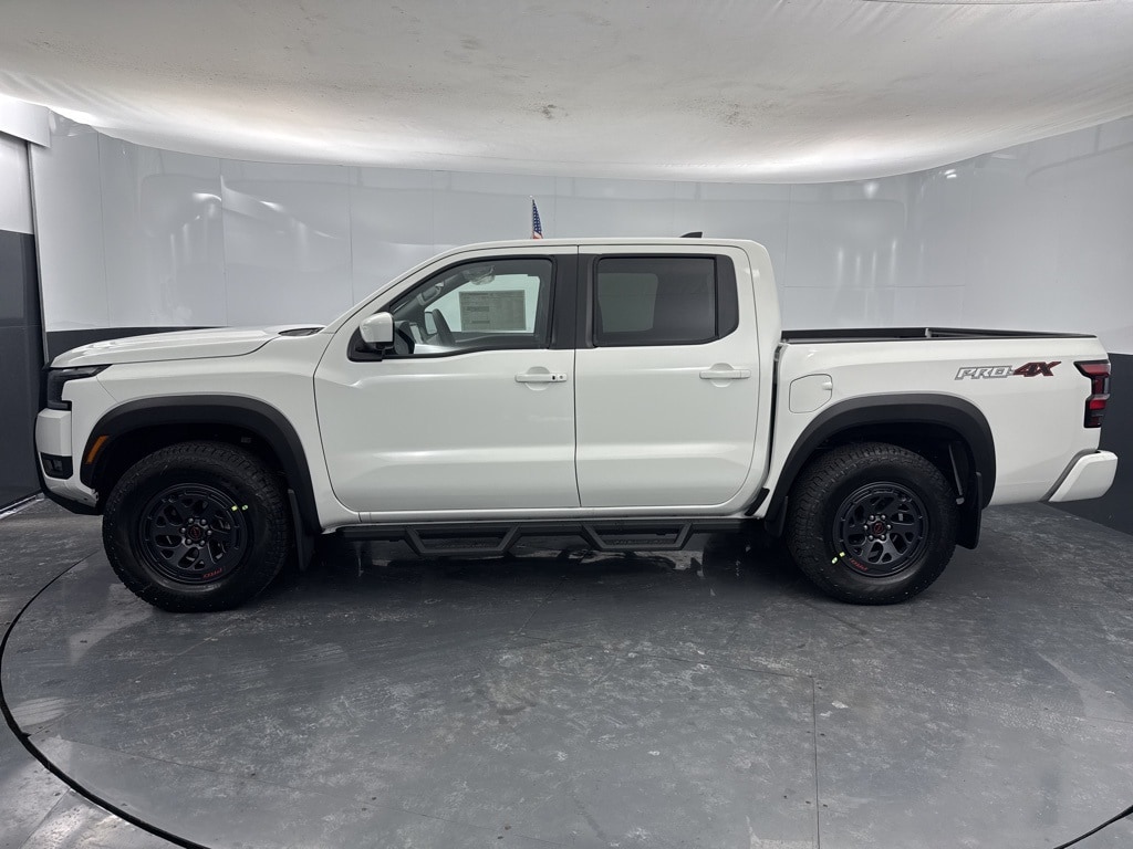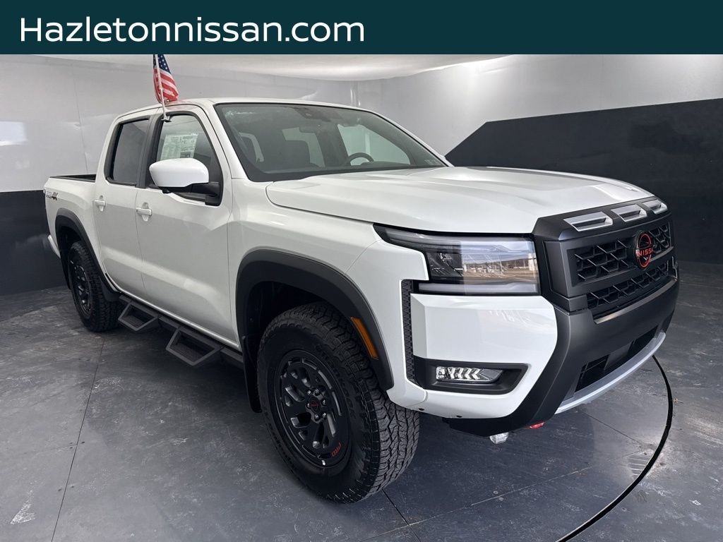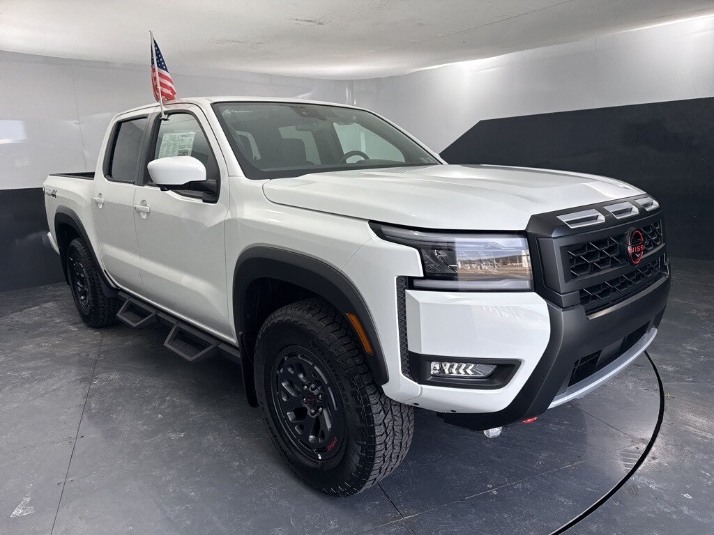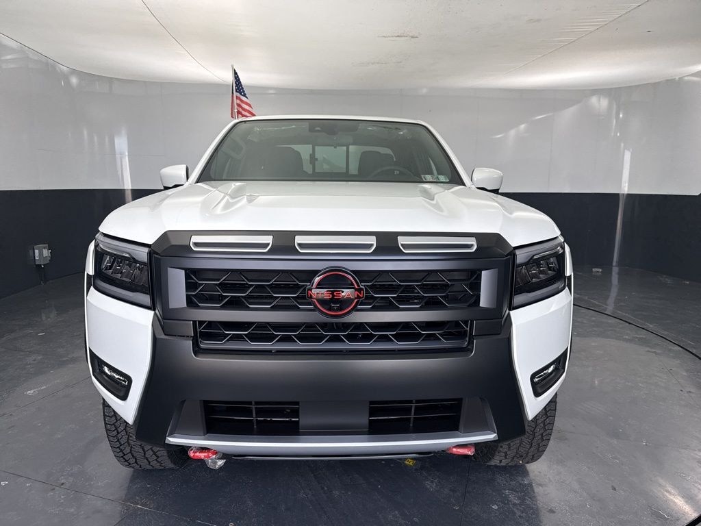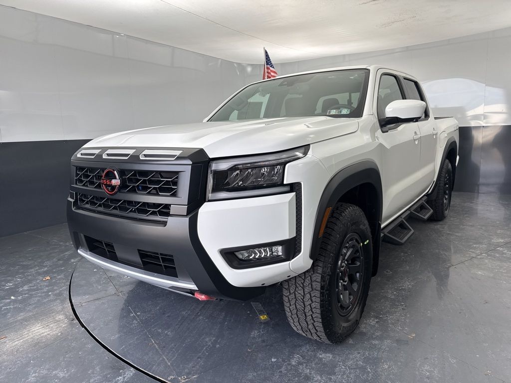 Glacier White 2026 Nissan Frontier PRO-4X 4WD 9-Speed Automatic with Overdrive 3.8L DI DOHC 24V V6 17" Painted Alloy Wheels, 3.692 Axle Ratio, 4-Wheel Disc Brakes, 6 Speakers, ABS brakes, Air Conditioning, Alloy wheels, AM/FM radio: SiriusXM, Anti-whiplash front head restraints, Auto High-beam Headlights, Automatic temperature control, Blind Spot Warning, Brake assist, Bumpers: body-color, Delay-off headlights, Driver door bin, Driver vanity mirror, Dual front impact airbags, Dual front side impact airbags, Electronic Stability Control, Electronic Tailgate Lock, Emergency communication system, Essentials Kit, Front anti-roll bar, Front Bucket Seats, Front Center Armrest, Front dual zone A/C, Front fog lights, Front reading lights, Front wheel independent suspension, Fully automatic headlights, Heated Front Bucket Seats, Heated front seats, Heated steering wheel, Illuminated entry, Knee airbag, Leather steering wheel, Low tire pressure warning, Mud Flaps, Occupant sensing airbag, Off-Road Style Step Rails, Overhead airbag, Overhead console, Panic alarm, Passenger door bin, Passenger vanity mirror, Power door mirrors, Power driver seat, Power passenger seat, Power steering, Power windows, PRO Embroidered Premium Cloth Seat Trim, PRO-4X Convenience Package, Radio data system, Radio: SXM/AM/FM/AUX/USB Audio System, Rear anti-roll bar, Rear seat center armrest, Rear side impact airbag, Rear step bumper, Remote keyless entry, Security system, Speed control, Speed-sensing steering, Split folding rear seat, Steering wheel mounted audio controls, Tachometer, Telescoping steering wheel, Tilt steering wheel, Traction control, Trip computer, Variably intermittent wipers, Voltmeter, Wireless Apple CarPlay/Wireless Android Auto.