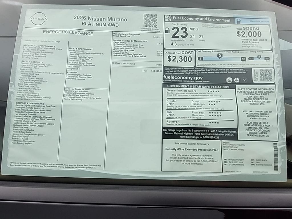 Super Black 2026 Nissan Murano Platinum AWD I4 ABS brakes, Active Cruise Control, Alloy wheels, Compass, Electronic Stability Control, Front dual zone A/C, Heated door mirrors, Heated front seats, Heated rear seats, Illuminated entry, Low tire pressure warning, Navigation System, Power Liftgate, Remote keyless entry, Traction control, 10 Speakers, 21" Alloy Wheels, 4-Wheel Disc Brakes, Air Conditioning, AM/FM radio: SiriusXM w/360L, Auto High-beam Headlights, Auto tilt-away steering wheel, Auto-dimming Rear-View mirror, Automatic temperature control, Brake assist, Bumpers: body-color, Child-Seat-Sensing Airbag, Delay-off headlights, Driver door bin, Driver vanity mirror, Dual front impact airbags, Dual front side impact airbags, Emergency communication system: NissanConnect Services, Four wheel independent suspension, Front anti-roll bar, Front Bucket Seats, Front Center Armrest, Front reading lights, Fully automatic headlights, Garage door transmitter: HomeLink, Heads-Up Display, Heated and Ventilated Front Bucket Seats with Massage, Heated steering wheel, Knee airbag, Memory seat, Navigation system: NissanConnect with Navigation and Services, Occupant sensing airbag, Outside temperature display, Overhead airbag, Overhead console, Panic alarm, Passenger door bin, Passenger vanity mirror, Power door mirrors, Power driver seat, Power moonroof: Panoramic, Power passenger seat, Power steering, Power windows, Quilted Semi-Aniline Leather-Appointed Seat Trim, Radio data system, Radio: NissanConnect with 4 Hybrid, Rain sensing wipers, Rear anti-roll bar, Rear reading lights, Rear seat center armrest, Rear side impact airbag, Rear window defroster, Rear window wiper, Security system, Speed control, Speed-Sensitive Wipers, Split folding rear seat, Spoiler, Steering wheel memory, Steering wheel mounted audio controls, Tachometer, Telescoping steering wheel, Tilt steering wheel, Trip computer, Turn signal indicator mirrors, Variably intermittent wipers, Ventilated front seats, Wireless Apple CarPlay/Wireless Android Auto, ABS brakes, Active Cruise Control, Alloy wheels, Compass, Electronic Stability Control, Front dual zone A/C, Heated door mirrors, Heated front seats, Heated rear seats, Illuminated entry, Low tire pressure warning, Navigation System, Power Liftgate, Remote keyless entry, Traction control.